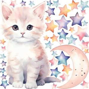 Des stickers nature pour votre déco ! Avec les stickers muraux nature multicolore et ce Stickers chaton étoiles avec la lune aquarelles, vous vous approprierez enfin votre intérieur ! Dimensions des stickers nature: Ce sticker déco chambre enfant se compose de : 1 sticker chaton aquarelle, 1 sticke
