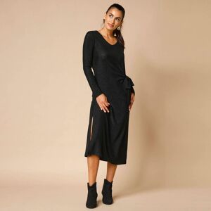 Taille• Longueur 115 cmComposition• Maille pailletée 50% polyamide, 45% fibres métalliques, 5% élasthanneDescription• Maille fluide pailletée• Col V• Coupe droite qui n'épouse pas les courbes• Manches longues• Découpe fantaisie avec liens à nouer • Grande fente coté• Base droite