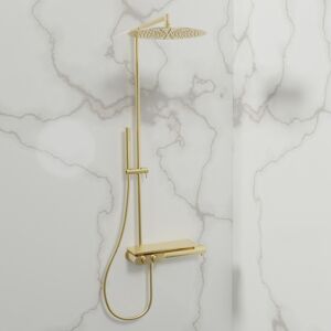 COLONNE DE DOUCHE THERMOSTATIQUE THERMO UP SANDWICH® BLACKMAT THERMO UP Colonne de douche avec réglage thermostatique Thermo up 38°C. Boutons poussoirs laiton sérigraphiés. Bras fixe. Entraxe 150 mm ± 15mm. Douche de tête Sandwich® ø 30 cm. Tablette support laiton sur thermostatique 332 x 103 mm. C