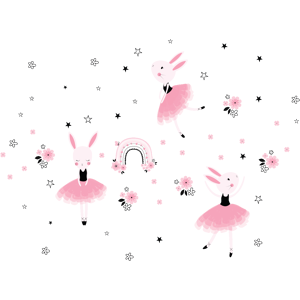 Des stickers animaux pour votre déco ! Avec les stickers muraux animaux multicolore et ce Stickers animaux lapines ballerines parmi les fleurs, vous vous approprierez enfin votre intérieur ! Dimensions des stickers animaux : La planche de H60 x L60 cm, le sticker lapin qui lève les bras mesure H45