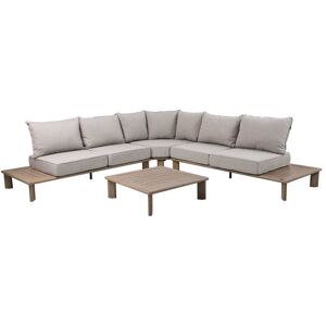 L'AXI Avery salon de jardin est un ensemble d'angle avec tables d'appoint. Cet ensemble comprend des tables d'appoint pratiques et une table basse séparée. L'ensemble est spacieux et peut accueillir 5 personnes. Avery est fabriqué en aluminium peint par poudrage et présente un aspect bois contemporain. Cela rend l'ensemble léger et durable, mais lui donne aussi l'aspect luxueux du bois véritable. Grâce aux coussins, vous pouvez rêver en tout confort. Que vous vous détendiez avec un livre ou que vous passiez un moment agréable avec des amis, cet ensemble de salon offre un confort d'assise parfait.Conseil : l'ensemble de salon AXI Avery est parfait pour être combiné avec la chaise longue AXI Blake.Design unique et durableL'ensemble de salon AXI Avery est fabriqué en aluminium de haute qualité avec une finition aspect bois. L'utilisation d'aluminium inoxydable rend le cadre et l'ensemble de salon non seulement solides, mais aussi légers. Vous pouvez donc facilement déplacer l'ensemble de salon. Grâce au revêtement en poudre, ce salon ne nécessite pas seulement que peu d'entretien, mais il est également résistant aux UV et à l'eau. Avery est livré avec des coussins confortables en oléfine de haute qualité. L'oléfine est un matériau qui se distingue par sa durabilité, sa résistance à la lumière du soleil et son caractère hydrofuge. Le matériau sèche rapidement après une averse et reste confortable même par temps humide.Dimensions et poidsL'ensemble de salon Avery a une dimension totale de 290 x 290 x 68 cm et se compose de deux bancs droits de 185 x 86 x 68 cm chacun et d'un banc d'angle. L'ensemble convient pour 5 personnes et a une capacité de charge maximale de 110 kg par siège. La hauteur d'assise de 40 cm permet de se prélasser confortablement. Idéal pour passer des moments agréables dans votre propre paradis extérieur.AXI Outdoor LivingComplétez votre