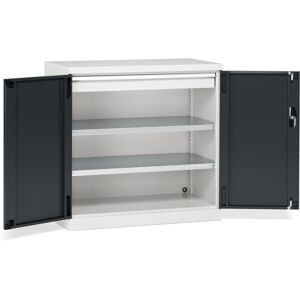 Armoire d'atelier métallique modèle Môle n°5 comprenant : > 2 tablettes galvanisées rainurées réglables en hauteur tous les 25 mm. Charge par tablette 100 kg. > 1 tiroir simple extension dim. Hors-tout L.908*P.449*H.100 mm (H. utile 85 mm), extension simple à 87% Charge par tiroir 50 kg. > Structure métallique monobloc Caractéristiques techniques > Peinture électrophorèse cuite au four. Colori