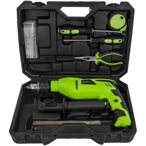 Coffret Perceuse à percussion et accessoires 38 pièces, pratique et polyvalent. L'outil principal de ce coffret est une perceuse à percussion compacte de 750W pour une utilisation polyvalente. De conception légère, elle assure un grand confort de travail. Le mandrin à clé vous assure un changement d'outils efficace.