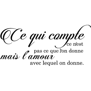 Des stickers Amour pour votre déco ! Avec les stickers muraux Amouret ce sticker Ce qui compte c'est l'amour avec lequel on donne, vous pourrez enfin décorer l'intérieur de votre chambre à votre guise ! Apportez une ambiance de paix et d'amour dans votre maison avec ce sticker Ce qui compte c'est l