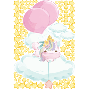 Des stickers enfants pour votre déco ! Avec les stickers muraux enfants et ce Sticker licorne planant dans les nuages + 100 étoiles, vous vous approprierez enfin votre intérieur ! Dimensions des stickers enfants: Ce sticker prénom personnalisé se compose de licorne dans les nuages avec ses ballons