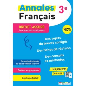 Binding : paperback, Label : Brevet assuré - Annales - Français - 3e - 2025 : Des sujets corrigés, des fiches de révision, des conseils et méthodes, Format : big_book, medium : paperback, numberOfPages : 256, publicationDate : 2024-09-12, languages : french, ISBN : 2820816819
