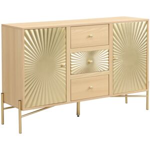 Optimisez l’organisation de votre bureau tout en apportant une touche d’élégance grâce à cette armoire à dossiers multifonction en bois clair. À mi-chemin entre mobilier professionnel et pièce de décoration, ce meuble vous offre un équilibre parfait entre praticité et esthétisme.Un rangement pensé pour les espaces de travailConçue pour les professionnels comme pour les particuliers en télétravail, cette armoire permet de garder vos documents parfaitement rangés et accessibles. Elle se compose de :Trois tiroirs centraux pour classer dossiers suspendus, fournitures de bureau, papiers administratifs ou effets personnels.Deux placards latéraux avec étagères intérieures, idéals pour les classeurs, boîtes d’archives, cahiers ou livres.Un plateau supérieur spacieux pouvant accueillir imprimante, piles de documents ou éléments décoratifs.Un design distinctif et lumineuxLe point fort de cette armoire réside dans ses portes dorées sculptées, ornées d’un motif rayonnant inspiré du soleil. Cette finition luxueuse capte la lumière naturelle et ajoute une touche glamour à tout environnement de bureau. L’ensemble repose sur une structure métallique dorée qui garantit solidité, stabilité et modernité.Avec ses lignes sobres et ses détails brillants, ce meuble s’intègre aussi bien dans un bureau professionnel, une salle d’étude ou une bibliothèque privée.Matériaux de qualité et durabilitéFabriquée en panneaux MDF robustes, avec placage bois clair pour un rendu naturel et chaleureux, cette armoire est conçue pour durer. Les poignées rondes dorées assurent une prise en main facile et un usage confortable au quotidien.Les pieds métalliques dorés ajoutent non seulement à l’esthétique générale, mais aussi à la stabilité de l’ensemble, même en cas de charge lourde.Assemblage simpleLe meuble est livré à monter soi-même avec une notice détaillée. Chaque pièce est numérotée pour un montage rapide et sans difficulté, même sans expérience.