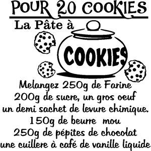 Des stickers cuisine pour votre déco ! Avec ce stickers pour la cuisine représentant un Sticker citation recette La pâte à cookies vous pourrez décorer votre intérieur de manière originale et facile! Vous allez pouvoir donner une nouvelle vie à cette pièce si fréquemment utilisée ! Où coller cet au
