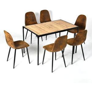 Apportez caractère et convivialité à votre salle à manger avec cet ensemble repas au style industriel, composé d’une table rectangulaire effet bois naturel et de six chaises en suédine marron vintage. À la fois pratique, robuste et esthétique, il est pensé pour accueillir famille et amis autour de repas chaleureux.Table effet bois naturel, sobre et fonctionnelleLa table rectangulaire séduit par son plateau décor bois clair, aux veinures réalistes, apportant une chaleur visuelle à votre intérieur. Sa structure en métal noir au design minimaliste renforce l’allure industrielle tout en garantissant solidité et stabilité. Avec ses dimensions généreuses (environ 120 x 75 cm), elle permet de rassembler jusqu’à 6 convives dans un confort optimal.6 chaises en tissu suède brun, look vintageLes chaises qui accompagnent la table sont dotées d’une assise incurvée et d’un dossier haut, pour un soutien ergonomique optimal. Le revêtement en polyester effet suède brun patiné apporte une touche rétro, rappelant le cuir vieilli, mais avec un entretien simplifié. Les pieds en métal noir fuselés assurent une excellente stabilité et s’accordent parfaitement avec la table.Un style industriel chic et intemporelCe set marie subtilement les matériaux bruts et les formes épurées :Plateau imitation bois vieilliStructure métal noir matChaises effet cuir vintageIl s'intègre parfaitement dans un intérieur loft, urbain, rustique ou même contemporain, en créant une atmosphère chaleureuse et authentique.