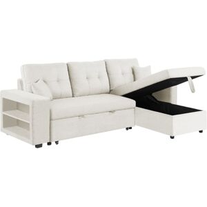 GLASGOW - Canapé d'angle convertible beige 4 places Le canapé d'angle convertible est un meuble élégant et fonctionnel qui offre à la fois confort et praticité. Ce canapé est conçu avec un design moderne et contemporain.La couleur beige du tissu du canapé lui donne un aspect élégant et s'harmonise facilement avec différents styles de décoration intérieure. L'un des points forts de ce canapé d'angle est sa fonction convertible. Il peut être transformé en un lit confortable en quelques gestes simples, offrant ainsi une solution pratique pour accueillir des invités ou pour une utilisation quotidienne si nécessaire. Grâce à son mécanisme facile à utiliser, vous pouvez passer du mode canapé au mode lit en un rien de temps. Une caractéristique unique de ce canapé est la présence d'étagères intégrées dans les accoudoirs ainsi que d'un grand coffre de rangement. Ces étagères offrent un espace de rangement supplémentaire pour vos livres, magazines, télécommandes, ou autres objets du quotidien que vous souhaitez garder à portée de main tout en étant confortablement installé sur votre canapé. Son grand coffre de rangement vous permet d'y ranger tout le linge de lit pour accueillir vos convives. En termes de confort, ce canapé est doté de coussins rembourrés épais qui vous permettra de passer un bon moment de détente. En résumé, son design moderne, sa fonction convertible et ses étagères intégrées en font un meuble attrayant qui offre à la fois confort et espace de rangement supplémentaire. Caractéristiques techniques Nombre de places : 4 Couleur tissus : Beige Revêtement : Tissu de lin Piètement : Bois et plastique Nombre de pieds : 4 Angle réversible : Non Coussins fournis : Non Densité assise: 45 kgs / m3 Densité dossier: 45 kgs / m3 Suspensions dossier : Sangles Suspensions assise : Ressorts Convertible : Oui Entretien Nettoyage facile à l’aide d’un chiffon humide Dimensions Dimension totale : 233 x 113 x 93 cm Dimension du couchage : 196 x 113 cm Hauteur pied : 5 cm Haute