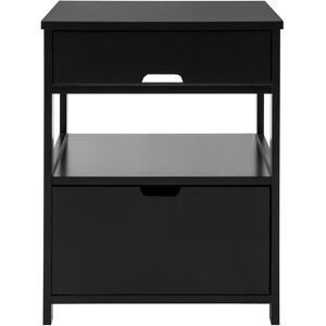 Solution de rangement compacte et élégante, aspect et toucher neufs.Elle se trouvera sa place facilement dans votre environnement de vie, que ce soit dans la chambre comme une table de chevet, le salon comme une table d'appoint ou bout canapé, ou le couloir comme une table de téléphone.Les deux tiroirs avec glissières en métal et arrêt bout de course vous offrira d'espace de stockages fermés pour optimiser votre rangement.1 étagère pour vous permettre de pouvoir ranger vos livres.Tapis protecteurs antidérapant pour éviter les dommages causés par les rayures.Matériau: bois MDF laqué noir.Dimensions : L45 cm x P38 cm x H55 cm.Capacité maximum : 50 kg.Poids de l'envoi : 12,8 kg.
