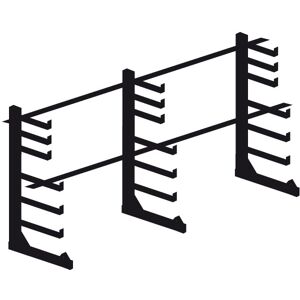 Rayonnage Cantilever léger double face pour barres de 3 m avec > 3 montants doubles de hauteur 1850 mm + pieds > 4 traverses de longueur 1300 mm > 9 bras doubles de longueur 350 mm > 9 bras doubles de longueur 500 mm Visserie fournie mais fixation au sol à prévoir. Caractéristiques techniques > Charge par face de bras support : 400 kg maxi > Charge totale : 14 400 kg > Bras support