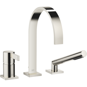 Dornbracht Mem mélangeur de bain à trois trous 27412782-06 Projection 220 mm Bec : jet normal Set de douche à main avec système anti-calcaire commutation automatique bain/douche Hauteur du robinet 300 mm Hauteur jusqu'à aérateur 170 mm Diamètre du trou bec 32 mm Diamètre du trou du mélangeur à levier unique 35 mm Diamètre du trou de l'ensemble de douche flexible 32 mm Rosace pour mélangeur 60 x 60 mm Rosace pour bec 60 x 60 mm Rosace pour set de douche flexible 60 x 60 mm Flexible de douche en métal 2250 mm avec protection anti-torsion intégrée Débit maxi 20 4 l/min à une pression de débit de 3 bar Set de douche flexible à débit maxi 6 8 l/min à sécurité intrinsèque contre les refoulements