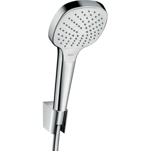 hansgrohe Croma Select E Vario set de douche Numéro d'article 26593400 Surface: blanc / chrome Ensemble composé d'une douchette, d'un tuyau de douche et d'une barre de douche avec toboggan Douchette: Taille de la pomme de douche: 110 mm Forme de pomme de douche: angulaire grande douche avec distribution d'eau optimale (performance XXL) 3 types de pulvérisation : Rain, TurboRain, IntenseRain Changement de Select pratique Select bouton Select élimination sans effort des dépôts de calcaire en essuyant doucement (QuickClean) avec EcoSmart, débit maximum (à 3 bar): 9 l / min crépine rincable adapté pour Chauffe-eau Barre de douche avec flexible d'infusion: pivotant côté douche contre la torsion gênante du tuyau de douche Tuyau de douche résistant aux plis, flexible et facile à nettoyer Longueur du tuyau de douche: 1600 mm Hauteur du rail de douche: 959 mm Distance de perçage: 915 mm Angle d'inclinaison du curseur réglable de 45 °, le curseur pivote à gauche et à droite, et de haut en bas support mural en plastique chromé