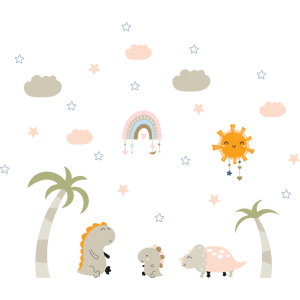 Des stickers dinosaures pour votre déco ! Avec les stickers muraux dinosaures et ce Stickers dinosaures en famille sous les étoiles, vous vous approprierez enfin votre intérieur ! Dimensions des stickers enfants : Ce sticker dinosaure déco chambre garçon se compose de : 1 sticker palmier, 1 sticker