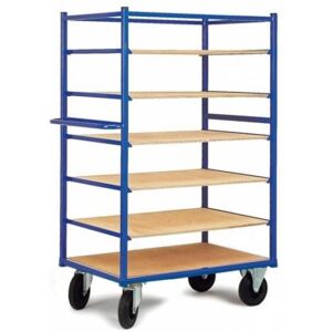 Chariot à 6 étagères spécialement conçu pour le stockage de produits sur étagères ou en vrac. Structure en tubes d'acier soudé. Les étagères en bois sont amovibles et ont une épaisseur de 16 mm. Elles sont réglables en hauteur au pas de 50 mm. Le chariot est équipé d'une barre de poussée en tube ...