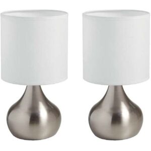 Set de 2 délicates lampes design qui offrent une fonction tactile pour faire office de lampe de chevet comme de lampe à poser partout. La lampe tactile IDA fonctionne en ON/OFF par un simple contact sur son pied chromé et se glisse dans toutes les décorations grâce à son abat-jour blanc. Garantie 2 ans - Classe II - Livrée sans ampoule Deux ravissantes petites lampes tactiles toutes simples qui proposent néanmoins la fonction tactile par effleurement sur leur pied chromé. Lampe de chevet design par le mariage judicieux du métal chromé et du textile blanc, vos lampes sont faites pour s'adapter à toutes les décorations ! A poser dans l'entrée pour ne pas avoir à chercher l'interrupteur, cette lampe tactile de faible encombrement est un accessoire lumineux incomparable et fort utile ! Mais c'est dans une chambre à coucher que vos 2 lampes de chevet trouveront toute leur mesure pour vous éclairer une fois la nuit venue et pour vous éviter d'avoir à chercher l'interrupteur dans le noir. pratique non ? Non décidément, cette lampe a toutes les qualités !... et c'est le parfait cadeau de fête de mères ou fête des pères, pensez-y ! Caractéristiques techniques de la lampe de chevet IDA chrome et abat-jour blanc : Hauteur totale : 28 cm Hauteur abat-jour : 15 cm Diamètre pied : 12,5 cm Diamètre abat-jour : 15 cm 2 Lampes à poser tactiles avec pied en métal couleur chrome mat et abat-jour blanc. A brancher sur secteur fil alimentation pvc noir. Ne pas utiliser avec une prise commandée. Nécessite 1 ampoule E27 max. 20W non fournie pour chaque lampe (voir les offres d'ampoules du catalogue Millumine) Existe également en version laiton Garantie 2 ans - Classe II
