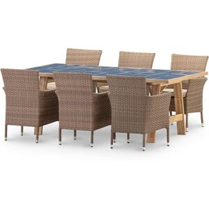 Pack de 6 chaises pliantes en bois d’acacia avec accoudoirs. La base de l’assise et le dossier sont en rotin synthétique imitant la finition naturelle enea. La finition du bois est dans un ton clair. Mesure 56,5x53,5x85cm. Poids 7kg\nTable de jardin en acacia de couleur claire avec plateau en céramique 20x20 en finition vitrée bleue. La construction de la table est très robuste et résistante. Vous pouvez la combiner avec le reste des éléments de la famille Java Light, et en même temps c’est une table très polyvalente qui peut être combinée avec des éléments métalliques industriels, classiques, rustiques, modernes...