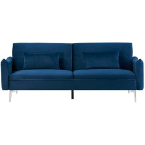 Canapé design convertible 3 places en velours bleu et pieds en métal Apportez une touche tendance à votre séjour grâce à canapé design en velours bleu nuit. Ses lignes épurées et ses pieds en métal argentés donnent du charme et de l'élégance au canapé tout en lui donnant un côté vintage. Sa jolie couleur bleu nuit fera de ce canapé la pièce incontournable de votre salon. Le velours a l'avantage d'être facile à entretenir, d'être confortable et agréable à toucher. Son dossier offre 3 positions d'inclinaisons afin de s'adapter au mieux à vos besoins et vous offrir le confort que vous recherchez. En plus d'être élégant et confortable il est convertible ce qui vous permet d'avoir un couchage supplémentaire pour accueillir vos proches. Caractéristiques techniques Nombre de places : 3 Couleur : Bleu foncé Revêtement : Velours Piètement : Métal Nombre de pieds : 5 Structure : Bois massif (eucalyptus) et panneaux à particules 3 inclinaisons Accoudoirs fixes Suspensions dossier : Sangles Suspensions assise : Ressorts Assise : Une couche inferieure de mousse de 50 kg / m3 et d'une couche supérieure Mousse 25 kg / m3 + ouate 150g/m3 Dossier : couche de mousse inférieure de 50 kg/m3 et supérieure de 25 kg/m3 + ouate 150 g/m3 Convertible : Oui Déhoussable : Non Confort : Ferme Poids maximum supporté : 300 kg Entretien Nettoyage facile à l’aide d’un chiffon humide. Ne pas utiliser de solvant. Dimensions Dimension du canapé : 204 x 94 x 81 cm Dimension du couchage : 204 x 108 x 41 cm Hauteur pieds : 17 cm Hauteur assise : 42 cm Profondeur assise : 52 cm Epaisseur assise : 25 cm Hauteur dossier : 81 cm Epaisseur dossier : 20 cm Dimensions de l’accoudoir : 10 x 44 cm Poids total : 45 kg Conditionnement Le produit est conditionné dans deux colis de : 185 x 110 x 25 cm / 45 kg Montage facile une notice est fournie. *Au choix : Livraison pas de porte gratuite ou livraison à l'étage dans la pièce de votre choix payante * Garantie 2 ans