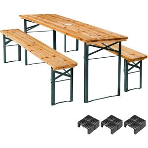 Avec l'ensemble de brasserie Ludwig de tectake, l'ambiance festive s'installe chez vous en un clin d'œil. La table en bois est dotée au centre d'un support pour parasol qui peut être recouvert. Cela vous permettra de faire la fête à la fraîche sur cet ensemble de bancs résistant, même par temps chaud. Grâce aux charnières solides, au piètement en acier lâqué époxy et aux capuchons en plastique à clipser, les meubles de jardin pliables sont non seulement très robustes et stables, mais également utilisables sur des sols fragiles. Le bois verni au vernis transparent rend le salon Ludwig imperméable et durable, de sorte qu'il vous offre, à vous et à vos amis, un petit coin confortable lors de nombreux anniversaires et barbecues. Caractéristiques Techniques: BancDimensions (LxPxH) : env. 170 x 23 x 47,5 cmDimensions repliées (LxPxH) : env. 170 x 23 x 6 cmÉpaisseur du bois : env. 2,5 cmEmbouts en plastique (LxPxH) : env. 3,7 x 3,5 x 4 cmPoids max. supporté : 300 kgPoids : env. 6,6 kgMatériau : acier lâqué époxy, sapin TableDimensions (LxPxH) : env. 170 x 46 x 78 cmDimensions repliées (LxPxH) : env. 170 x 46 x 6 cmÉpaisseur du bois : env. 2,5 cmDiamètre du support de parasol : env. 4 et 5 cmCapuchons en plastique (LxPxH) : env. 3,7 x 3,5 x 4 cmPoids max. supporté : 100 kgPoids : env. 11,1 kgMatériau : acier lâqué époxy, sapin