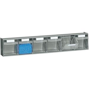 Module rangement atelier Practicbox avec 6 tiroirs basculants composé de > Structure en plastique rigide. > 6 Tiroirs en plastique transparent ABS. Points forts : > Solidité : tiroir en ABS inaltérable. > Grande angle d'ouverture pour faciliter la préhension des fournitures. > 6 tiroirs amovibles et basculants. Dimensions > Hors tout H. 112 x L. 600 x P. 91 mm > P