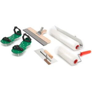 Ce set contient tous les outils nécessaires au professionnel comme au bricoleur totalement inexpérimenté pour niveler un sol avec des mortiers de coulée tels que l'Egaline.L'ensemble se compose de :Un grand rouleau à piquer en plastique avec protection contre les éclaboussures pour le montage sur tigeUn petit rouleau à piquer en plastiqueBottes piquantes - semelles à clous sous-boisUne truelle de nivellement avec poignée de fixationUne truelle adhésiveLes deux premiers outils de la liste sont des outils permettant d'éliminer les bulles d'air du mortier de coulée. Les chaussures à piquer sont censées permettre de marcher dans le mortier de coulée liquide sans repousser le mortier et laisser des traces de pas. Avec la raclette d'égalisation, vous étalez le mortier de coulée sur la surface à égaliser et rendez la surface coulée un peu plate. La gravité devra alors faire le reste. Pendant le séchage, vous pouvez encore faire des corrections avec la truelle de lissage. Il y a un outil pour chaque étape du processus de nivellement dans ce kit!