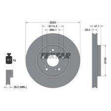 Axe de carrosserie: Avant. Côté d'assemblage: Gauche/Droite. Diamètre du trou [mm]: 12,7/114,3. Diamètre du trou central [mm]: 64.1. Diamètre extérieur [mm]: 293.0. Diamètre intérieur [mm]: 155.0. Disque avec roulement: Non. Fabricant: ATE. Hauteur [mm]: 47,1. Index: 24.0128-0217.1. Nombre de trous de fixation: 5.0. Numéro du fabricant: 24.0128-0217.1. Surface: revêtu. Type de disque: Aéré. Épaisseur [mm]: 28.0. Épaisseur minimale [mm]: 26.0.