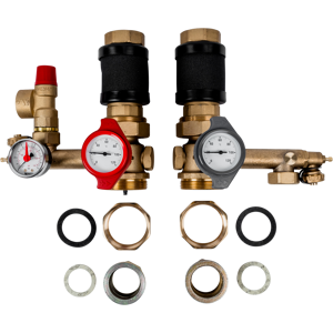 Wolf Cgb groupe de connexion circuit de chauffage 2070434 pour raccordement direct à la chaudière gaz à condensation se composant de: soupape de sécurité 3 bar Thermomètre avec Thermomètre Clapet anti-retour Manomètre 1930 -10 bar raccord 2000 "pour 2000 expansion Un robinet KFE chacun dans le départ et le retour Connexion supérieure 2000 2000 / 2 " Connexion inférieure à 2 " Hauteur de construction 200 mm