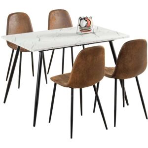 Vous rêvez d'une salle à manger chic et retro dans l'air du temps, où convivialité rime avec goût ? Ajoutez une touche charme et des couleurs contrastes à votre salle à manger avec notre ensemble table et 4 chaises scandinaves. Le table de 120 cm est idéale pour les réunions en famille ou entre amis. Style moderne et élégante : Cette table à manger blanche présente un design effet marbre et pieds noir, avec les chaises look rétro et leur tissu effet suède/daim doux au toucher, ensemble cette combination raffinée et ses lignes épurées ajouter une touche de charme vintage à votre espace de vie.Pour 4 personnes : Grâce à son large plateau de la table 120*70 cm, la table offre de l'espace pour 4 personnes pour partager un repas à plusieurs ou discuter autour d'un verre. La table se nettoie facilement avec un chiffon humide.Confort de la chaise : Le dossier est conçu avec une courbure légère pour s'adapter parfaitement à votre dos, offrant ainsi un confort optimal, même après des heures d'utilisation.Polyvalence : Les chaises de salle à manger sont polyvalentes et peuvent être utilisées dans une variété de situations, que ce soit pour partager un repas copieux en famille ou entre amis, travailler au bureau ou simplement se détendre en lisant un livre. Leur conception ergonomique et leur confort en font un choix idéal pour toutes les occasions.Montage : La table et les chaises sont faciles à assembler et les outils nécessaires ainsi que les instructions sont inclus pour un montage rapide et sans effort. Des embouts en caoutchouc anti-bruit et résistant à l'usure sont fixés aux pieds pour protéger votre sol des rayures. Caractéristiques :Table :Plateau : en MDF, PVC texturé marbre blancPied : Métal noirDimensions du produit : 120*70*75cmPoids net/brut : 18.2/20.6 kgDimensions du colis : 86*66*20 cm Chaises :Structure : Panneaux de contreplaqué en hêtre.Revêtement : Tissu de microfibre 100% polyester effet suède/daimPieds en métal avec finition peinture noire.Assise rembourrée et recouverte d'un tissu microfibre.Dimensions du produit : 52*40*86 cmPoids net/brut: 15.6/18.35 kgDimensions du colis: 55*45*64 cmGarantie :2 ans (voir politique de garantie)Remarque : ce produit est divisé en 2 colis, veuillez vous assurer d'avoir reçu les 2 colis avant l'assemblage !