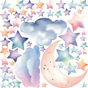 Des stickers nature pour votre déco ! Avec les stickers muraux nature multicolore et ce Stickers étoiles avec la lune et les nuages aquarelles, vous vous approprierez enfin votre intérieur ! Dimensions des stickers nature: Ce sticker déco chambre enfant se compose de : 1 sticker lune en aquarelle,