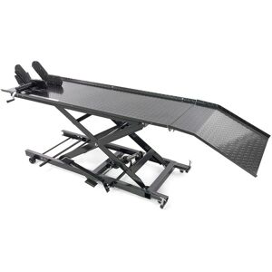 Avec la table élévatrice moto HBM 450 kg, vous placez sans effort des motos de taille moyenne, cyclomoteurs et scooters à une hauteur de travail confortable. Le pont est équipé de deux pédales hydrauliques : la grande sert à pomper le plateau vers le haut, la petite permet d’abaisser la table avec contrôle. Assurez toujours correctement votre deux-roues en utilisant les trous prévus dans le rebord de la table. Lors de l’entretien, il est essentiel d’avoir une bonne visibilité sur les pièces ; cette table élévatrice est l’outil idéal. Elle évite aussi les postures pénibles et donc les douleurs dorsales et musculaires. La roue avant se bloque dans l’étau du serre-roue, dont l’intérieur caoutchouté protège la jante. N’utilisez que de l’huile pour cric pour le système de levage.