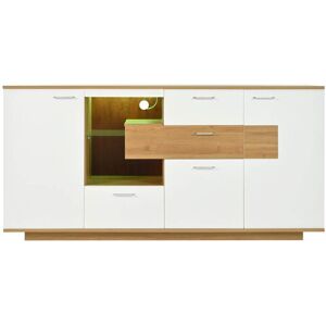 1. Un design harmonieux aux lignes géométriquesCe buffet se distingue par son style géométrique marqué, alliant des formes droites et symétriques pour un rendu épuré et moderne. L’alternance entre le blanc mat des portes et tiroirs et les accents en chêne clair naturel apporte un contraste visuel doux et chaleureux. Ce mariage de couleurs évoque les tendances scandinaves actuelles, parfaites pour créer une atmosphère apaisante et lumineuse dans votre intérieur.2. Un éclairage LED intégré pour une touche high-techLe véritable point fort de ce buffet réside dans l’intégration d’un éclairage LED à l’intérieur de la niche vitrée. Disponible en plusieurs couleurs selon les réglages (bleu, vert, etc.), cet éclairage offre une ambiance lumineuse tamisée, idéale pour mettre en valeur vos objets de décoration ou vaisselle exposée.Non seulement pratique pour retrouver facilement vos affaires, cette lumière douce transforme votre meuble en véritable élément décoratif, surtout en soirée. Elle donne vie à l’espace et attire naturellement le regard.3. Une capacité de rangement optimale et bien penséeCe buffet est équipé de :Deux grands tiroirs en partie centrale, parfaits pour ranger nappes, couverts, petits appareils ou documents.Quatre portes qui dissimulent des étagères internes réglables pour accueillir de la vaisselle, des livres, des accessoires ou du linge de maison.Une niche vitrée éclairée, idéale pour exposer des objets décoratifs, de la verrerie ou des souvenirs.Chaque compartiment est pensé pour offrir un accès facile tout en optimisant l’organisation. Vous pouvez ainsi garder un intérieur rangé sans sacrifier l’esthétique.4. Des matériaux durables et faciles d’entretienFabriqué à partir de panneaux de particules de haute qualité, ce buffet offre une bonne robustesse tout en restant léger pour le transport. Les finitions en mélaminé résistent aux rayures, à l’humidité et aux taches, ce qui le rend parfait pour un usage quotidien.Un simple chiffon doux suffit pour nettoyer la surface blanche et les parties en imitation chêne. L’entretien est rapide, sans produits spécifiques, ce qui est un véritable atout pour les foyers actifs.