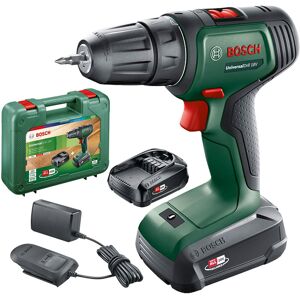 Outil sans fil polyvalent, compact et puissant pour tous les besoins L’engrenage 2 vitesses et les 20 positions de présélection de couple permettent de disposer d’une puissance et d’une vitesse de rotation adaptées a chaque application Forme sobre et ergonomique pour un grand confort d’utilisation Éclairage LED pour une visibilité optimale de la zone de travail Idéale pour les projets de perçage dans le bois, le métal, les plastiques et pour les vissages POWER FOR ALL : une batterie et un chargeur suffisent pour tout un systeme d’outils de la gamme Home & Garden Caractéristiques techniques de UniversalDrill 18V • Tension de la batterie: 18,0 V • Capacité de la batterie: 1,5 Ah • Régime a vide (1ere vitesse / 2eme vitesse): 0 – 440 / 1.450 tr/min • Couple maxi: 40,0 Nm • Couple maxi. vissage tendre/dur: 23 / 32 Nm • Présélections de couple: 20 + 1 • Mandrin de perçage: Mandrin automatique, 10 mm • Poids avec batterie: 1,20 kg • Compatibilité de la batterie: 18V POWER FOR ALL ALLIANCE • Poids net en kg: 0,880 kg • O de vissage maxi.: 8 mm • O de perçage dans l'acier: 10 mm • O de perçage dans le bois: 30 mm Accessoires fournis 2 batteries PBA 18V 1.5Ah W-A Embout de vissage double Chargeur AL 1810 CV Coffret de transport Conception compacte et légere et puissance modulable permettant une utilisation dans une grande variété de matériaux Cette perceuse-visseuse légere et compacte constitue le compromis idéal entre puissance et polyvalence. Son design ergonomique assure un maniement facile. Ses 20 positions de présélection de couple et sa position « Maximum » permettent d’adapter la puissance aux besoins de chaque application. L’engrenage planétaire 2 vitesses assure une longue durée de vie et une progression de travail rapide. L’UniversalDrill 18V constitue le choix idéal pour les perçages et vissages dans le bois, le métal et les plastiques. L’outil fait partie de l’ALLIANCE POWER FOR ALL. Une meme batterie peut etre utilisée sur un grand nombre d’outils de différentes marques.>