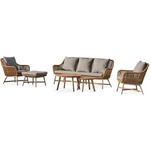 DESCRIPTION Salon de jardin SERENA 7 places certifié FSC® 100% en bois d'acacia et corde tissée, composé d'une table basse, d'un canapé 3 places, d'un canapé 2 places et de 2 fauteuils. Coussins 100% polyester gris.DIMENSIONSTable basse : L 120 x l 60 x H 39 cmCanapé 3 places : L 203 x l 80 x H 69 cmCanapé 2 places : L 139 x l 80 x H 69 cmFauteuil : L 69 x l 70 x H 69 cmCoussin d'assise : 10 cm d'épaisseurHauteur sol-assise : 32/42 cm