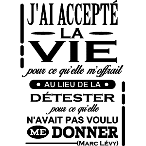 Des stickers muraux citations pour la déco ! Avec les stickers citation et ce Sticker citation J'ai accepté la vie - Marc Lévy, vous pourrez enfin décorer l'intérieur de votre cuisine à votre guise avec leur aide ! Apportez plus de bon sens dans votre vie comme ne pas espérer les choses à arriver a