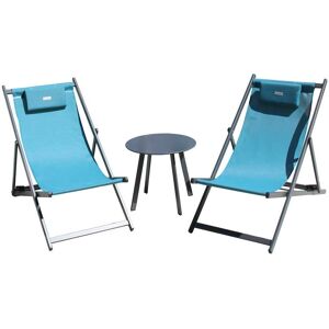 Notre ensemble détente Athos est parfait pour les amateurs de repos et sieste au soleil !Composé de deux chiliennes ATHOS et de la table d'appoint SUNNY, cet ensemble est parfait pour se reposer au bord de votre piscine ou terrasse en sirotant un jus de fruit frais.Les chiliennes ATHOS de dimensions L.110 x P.55.5 x H.97 cm disposent d'une structure en aluminium et d'une toile en polyester.Disponible en 6 coloris, elles sont légères, confortables et disposent 5 positions et un appui tête. Ajouté à ces dernières la table d'appoint SUNNY en acier Gris anthracite de dimensions D.50 x H.45 cm avec son plateau rond pour profiter pleinement de votre extérieur en duo