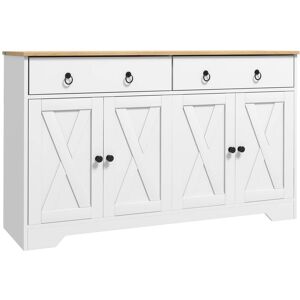 Description:Redonnez un coup de jeune à votre espace de vie avec le meuble bas de rangement style campagne HOMCOM ! Les 4 compartiments permettent de ranger la vaisselle, les casseroles et les poêles. De plus, vous pouvez adapter vos besoins de stockage avec 2 étagères réglables à l'intérieur du buffet. Quels que soient vos besoins en matière de rangement, ce buffet accueillera tous vos essentiels avec style.caractéristique:● Grand espace de rangement avec deux armoires et deux tiroirs pour ranger les fournitures quotidiennes; ● Buffet de salle à manger équipé de deux tablettes réglables pour accueillir des articles de différentes hauteurs; ● Meuble de salle à manger à conception de la porte de grange avec poignées en anneau ajoute un charme de ferme rustique; ● Peut être utilisé comme buffet, meuble de salle de bain ou meuble de rangement dans le couloir; ● Buffet en bois convient à la salle à manger, à la cuisine, au salon ou à d'autres espaces limités nécessitant un peu plus de rangement; ● Equipé de panneaux de particules, la surface lisse est facile à nettoyer en cas de déversements ou de dégâts; ● La conception anti-basculement aide à l'empêcher de tomber; ● Assemblage requis;Spécification:● Couleurs : blanc, marron; ● Matériau : panneaux de particules; ● Dim. totales : 121L x 37l x 75 H cm; ● Dim. intérieures des tiroirs : 52,3L x 29l x 10H cm; ● Dim. intérieures du placard : 57L x 32,2l x 23,4H cm (chaque niveau); ● Charge max. recommandée : 60 kg (total), 10 kg (étagère), 5 kg (tiroir); ● Réf. : 83A-058V81WT;contenu du colis:1 x Buffet; 1 x Manuel;