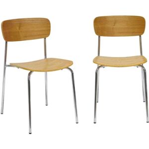 Les + produit :Vintage : Type écolierAssise et dossier en contreplaqué avec placagePiétement en métal, pieds avant ajustablesIdéal dans un bureau ou une salle à mangerToby, les chaises qui réveillent le charme vintageDans un bureau ou autour d’une jolie table de salle à manger, le duo de chaises Toby apporte une touche rétro pleine de caractère. Leur look inspiré des anciennes chaises d’écolier invite à la nostalgie, tout en s’intégrant parfaitement à une déco contemporaine. Le placage chaleureux du bois contraste avec l’élégance discrète du métal, qu’on choisisse la version chromée ou beige, selon l’ambiance qu’on veut créer. On s’y sent tout de suite bien, assis confortablement pour travailler, discuter, partager un repas… Et grâce à leurs pieds avant ajustables elles restent stables, où que vous les installiez.Dimensions et caractéristiques :Couleur : Effet bois de frêne / effet bois de noyerMatière de l'assise : Contreplaqué avec placageMatière du dossier : Contreplaqué avec placageMatière du piétement : Acier Couleur du piétement : Beige / ChroméPieds ajustables : Oui (x2)Nombre de chaises : 2Poids net : 3.6kg par chaisePoids max supporté : 110kg par chaiseStyle : Vintage Usage : domestique uniquement Utilisation : intérieure uniquement Montage : à monter, notice fournieGarantie : 2 ans DIMENSIONS :Chaise : L 43.5 x P 51 x H 77cmAssise : L 41.5 x P 42cmDossier : L 43 x H 17.5cmHauteur d'assise : 47.5cmEpaisseur des tubes : 1.2mmHauteur des pieds : 44.5cmEspace entre les pieds : L 41.5 x P 49cm