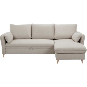 DRISS, un canapé tout confort !Ce canapé d'angle voit les choses en grand. Canapé, lit, rangement... DRISS est un canapé trois-en-un aux dimensions généreuses et au style superbe. Un joli revêtement beige en polyester enveloppe assise et dossier pour un rendu ultra cosy. Il est complété par quatre pieds en bois massif, aussi solides que déco. Grâce à son style scandinave affirmé, ce canapé d'angle convertible est un indémodable facile à vivre. Avec son épais rembourrage et ses jolis angles arrondis, ce n'est pas une assise de salon classique : c'est une véritable invitation à la détente.Le rembourrage de ce canapé d'angle réversible est composé de deux couches de mousse, une couche de mousse haute résilience pour la tenue et une couche de ouate pour le confort. Une fois l'assise tirée, ce convertible offre une belle surface de couchage (L140 x L205 cm) pouvant accueillir 2 personnes. La méridienne renferme un coffre de rangement, pratique pour le linge de lit.Ce canapé d'angle beige est réversible : vous pouvez positionner l'angle à droite comme à gauche. Le revêtement de ce canapé scandinave est en tissu déperlant pour faciliter son entretien. Canapé lit fabriqué en Europe. Livré prêt à monter.