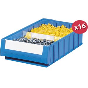 Lot de 16 bacs tiroirs Multibox profondeur 500 mm Caractéristiques techniques > Cloisonnement possible du bac tous les 50 mm (séparation transparente en option) > Emplacement porte-étiquette frontal. Etiquette fournie pour chaque bac. > Poignée de préhension réglable sur l'arrière du bac. > Bac gerbable. > Fabrication en polypropylène coloris Bleu. Dimensions > Bac : L.240 x P