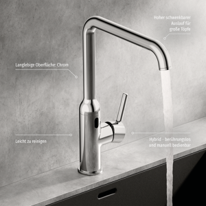 Robinet de cuisine hybride Hansa HANSAVANTIS Style 54212209 Assemblage du support Corps de vanne en laiton résistant à la dézincification (DZR) Débit à 3 bar (limiteur de débit) 10,8 l/min Alimentation en eau chaude max. +70°C Leviers avec marquage W+K Limiteur de température Raccordement via des flexibles de pression (G3/8) Dispositif de sécurité (EN1717) EB Cartouche de contrôle Ø 3 avec disques d'étanchéité en céramique pour le réglage de la quantité d'eau et de la température capteur PSD avancé avec autofocus électrovanne Rinçage hygiénique 30 sec. (1-1800 sec.) Durée de rinçage automatique 30 secondes (1-1800 secondes) Plage de pivotement de la sortie 120° Aérateur de type CASCADE Temps d'écoulement max. 10 sec. (1-1800 sec.) Tension de fonctionnement 230/9 V
