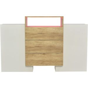 Offrez une touche de modernité et de raffinement à votre intérieur avec ce buffet au design contemporain, idéal pour le salon, la salle à manger ou un espace bureau. Alliant esthétique originale, fonctionnalité bien pensée et éclairage LED intégré, ce meuble est conçu pour répondre aux besoins de rangement tout en apportant une ambiance décorative unique.Un design original et élégant:Ce buffet se démarque par sa structure asymétrique et son jeu de volumes, avec une composition centrale en chêne naturel encadrée par deux colonnes latérales en blanc brillant. Cette combinaison de couleurs et de textures apporte un contraste subtil et chaleureux, parfait pour un intérieur moderne, minimaliste ou scandinave.Les lignes épurées et l’absence de poignées apparentes renforcent l’aspect contemporain du meuble, tout en offrant une prise en main facile grâce aux systèmes d’ouverture à pression.Organisation pratique et intelligente:Ce buffet est conçu pour maximiser le rangement tout en gardant un faible encombrement :3 tiroirs centraux spacieux en finition chêne naturel, parfaits pour organiser vos petits objets, documents, accessoires, vaisselle ou textiles de table.2 portes latérales dissimulant des compartiments internes offrant un grand volume de rangement pour tout ce que vous souhaitez garder hors de vue.1 niche ouverte rétroéclairée au sommet de la partie centrale, idéale pour mettre en valeur vos objets déco, livres, plantes ou souvenirs de voyage.Éclairage LED intégré – Ambiance moderne:La niche ouverte bénéficie d’un éclairage LED à lumière verte douce, qui crée une atmosphère cosy et élégante. Ce détail lumineux accentue la modernité du meuble tout en mettant en valeur les objets exposés. Idéal pour une ambiance tamisée en soirée ou pour illuminer un coin de pièce sans lampe supplémentaire.Matériaux solides et finition de qualité:Le buffet est fabriqué à partir de panneaux de particules de haute qualité (MDF/agglo), assurant robustesse et durabilité. Les surfaces sont faciles à entretenir : un simple chiffon doux suffit pour enlever la poussière ou les taches. Les finitions en blanc brillant ajoutent une touche lumineuse et agrandissent visuellement l’espace.Montage facile:Le meuble est livré à plat avec une notice de montage détaillée et illustrée. Tous les éléments nécessaires (visserie, pièces, éclairage LED) sont inclus pour un montage rapide à deux personnes.