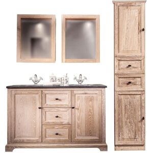 Agencez votre salle de bain familiale avec l'ensemble VERONE meuble double vasque et deux colonnes de rangement !Un meuble double vasque au style élégantAvec l'ensemble meuble double vasque et deux colonnes VERONE vous gagnez une multitude de rangements. Les colonnes sont dotées de deux espaces de rangement et deux tiroirs centraux chacune pouvant accueillir vos objets personnels.Avec deux miroirs avec éclairageLe meuble double vasque sera sans doute l'élément phare et authentique de votre salle d'eau. Les finitions soignées et les matériaux naturelles utilisés (chêne et pierre bleue) donnent à ce meubles une note chaleureuse et original. Doté de deux vasques céramiques et deux miroirs avec éclairage, ce meuble vous offre un grand espace pour accueillir tous vos objets de salle de bain. Description technique : Cet ensemble se compose d'un meuble de salle de bain en chêne massif blanchi (réf : BATH-032W) et d'une colonne de rangement avec ouverture à gauche (réf : BATH-032KL) et d'une colonne de rangement avec ouverture à droite (BATH-032KR)Le meuble double vasque • La partie basse de ce meuble est aménagée de 3 tiroirs utiles et de 4 portes.• La partie haute se compose de 2 miroirs aménagées de tablettes, d'un rangement central équipé de 3 tablettes et de 1 tiroir, et de 4 éclairages LED.• Le plan double vasque conçu en pierre naturelle bleue unique. • Dimensions du meuble : H 228 x L 181 x P 55 cm• Poids : 152 kgLes colonnes de rangement